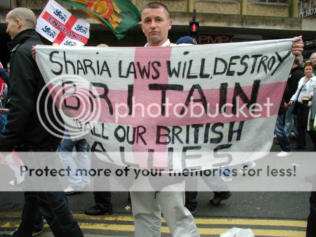 The only other way for an observer to get an idea what the EDL were about was some of the strange placards and banners. The homemade ones were my favourites including the well-travelled beach towel below: